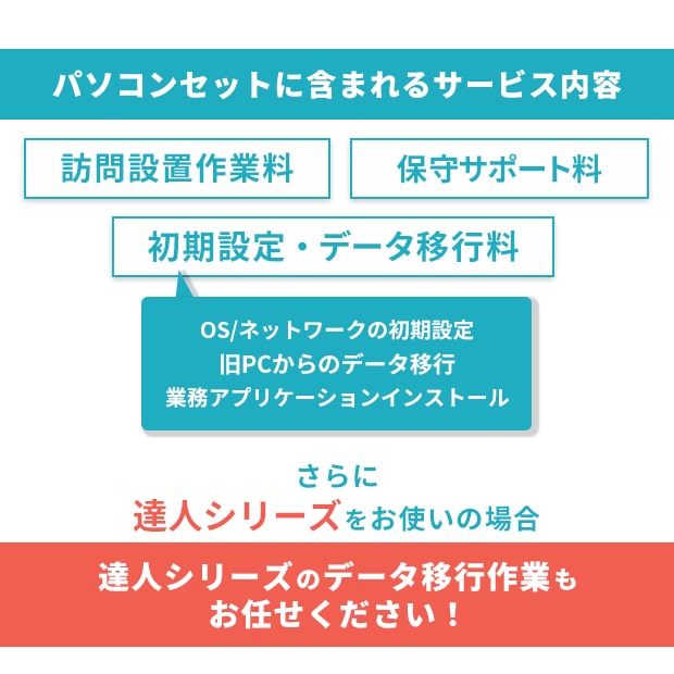 ※旧PCからのデータ移行及びアプリケーションインストールの範囲についてはお問い合わせください。
